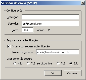 - Em Servidor preencha smtp.gmail.com e altere a Porta para 465.