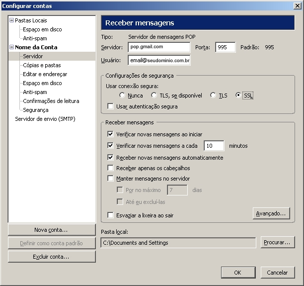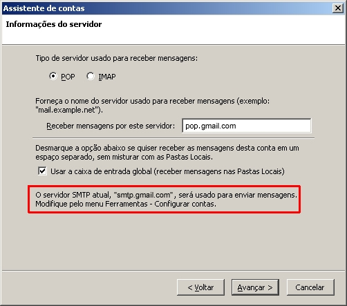 - Irá aparecer uma caixa com o servidor POP já preenchido, substitua-o endereço por pop.gmail.com e altere a porta para 995.