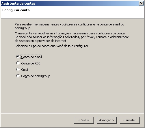 3. Escolha Conta de email e clique em Avançar.