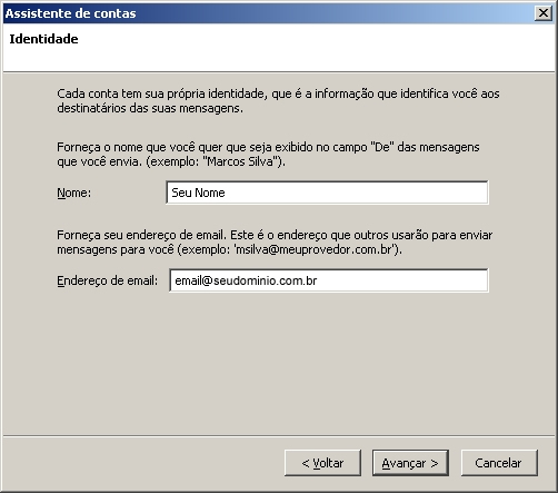 4. Preencha o campo Nome com o nome que deseja que as mensagens sejam enviadas e o endereço de e-mail completo e clique em Avançar.