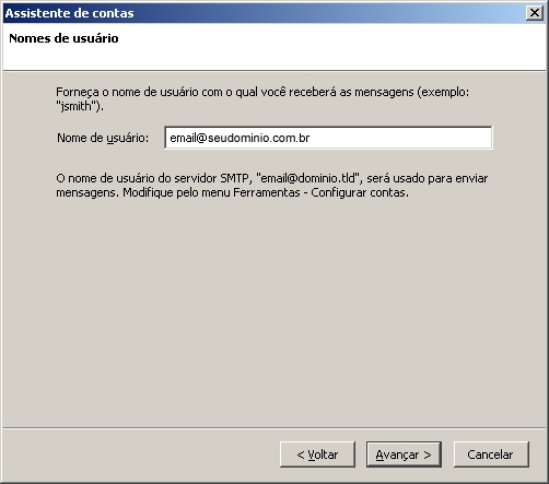 OBS: Caso essa seja a primeira conta configurada no programa irá aparecer o campo Nome do usuário do servidor SMTP, preencha o mesmo com seu e-mail completo.