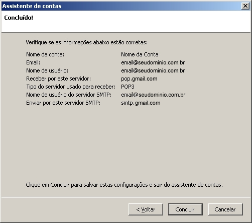 8. Será exibida uma tela com o resumo das configurações da conta. Clique em "Concluir"