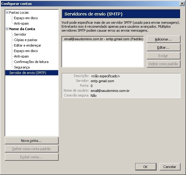OBS: Se você tiver outra conta configurada no programa é possível realizar o envio de mensagens através da mesma, porém não aconselhamos esse tipo de configuração, pois pode por em risco o recebimento das mensagens no servidor de destino, nesse caso sugerimos que você clique em Adicionar e inclua um novo servidor SMTP, seguindo as intruções a seguir.
